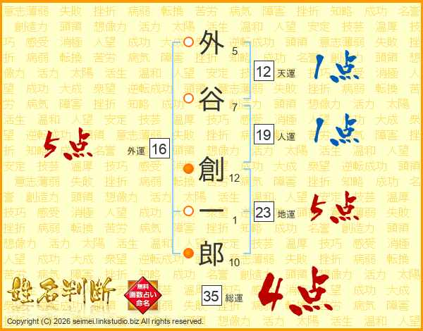 外(5画)谷(7画) 創(12画)一(1画)郎(10画)