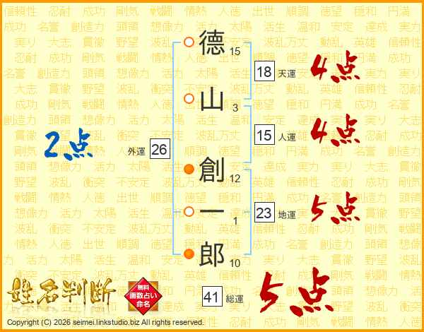 德(15画)山(3画) 創(12画)一(1画)郎(10画)