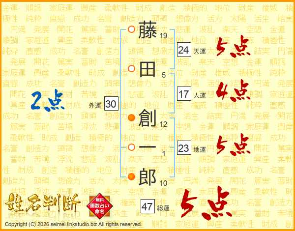 藤(19画)田(5画) 創(12画)一(1画)郎(10画)