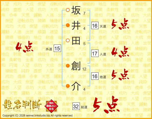 坂(7画)井(4画)田(5画) 創(12画)介(4画)