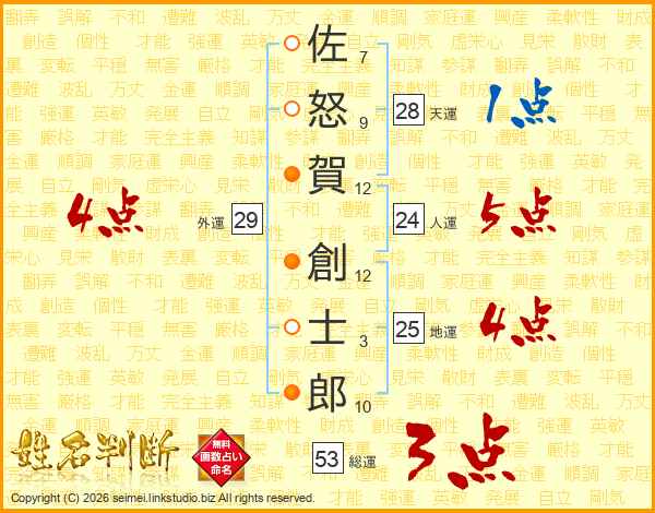 佐怒賀創士郎さんの総運は53画の3点!