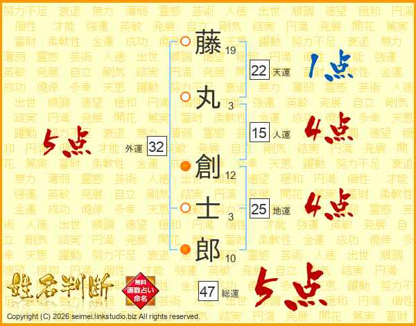 藤(19画)丸(3画) 創(12画)士(3画)郎(10画)