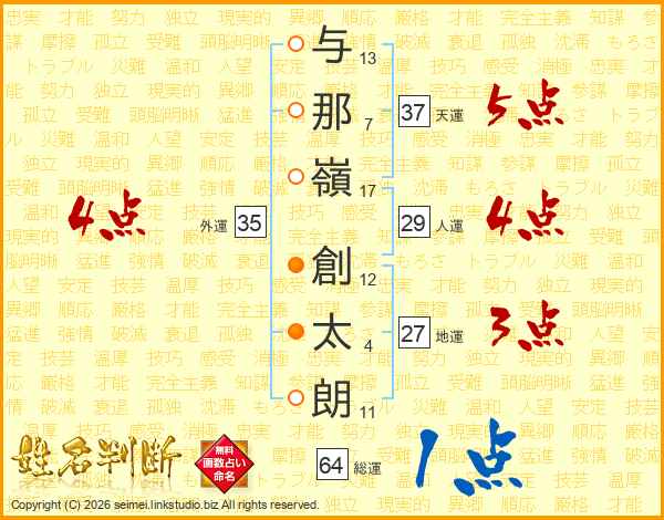 与(13画)那(7画)嶺(17画) 創(12画)太(4画)朗(11画)
