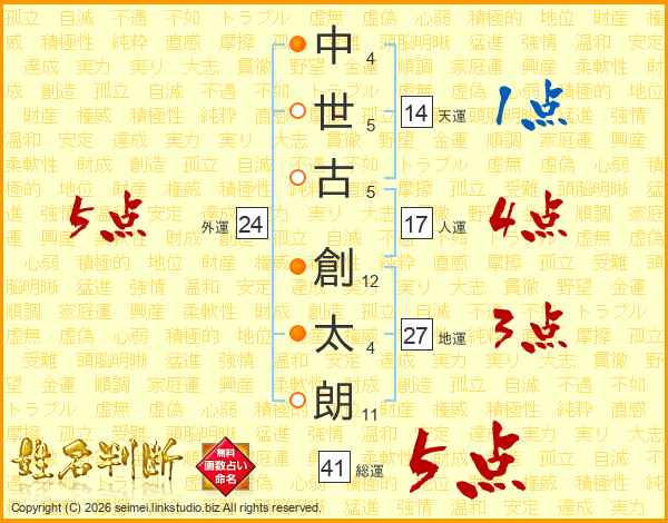 中(4画)世(5画)古(5画) 創(12画)太(4画)朗(11画)