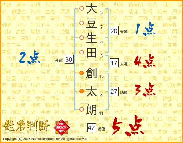 大(3画)豆(7画)生(5画)田(5画) 創(12画)太(4画)朗(11画)
