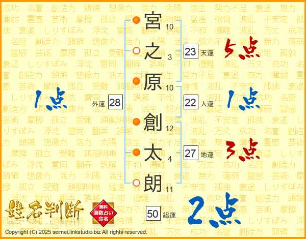 宮(10画)之(3画)原(10画) 創(12画)太(4画)朗(11画)