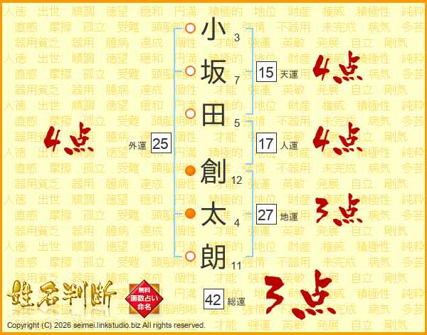 小(3画)坂(7画)田(5画) 創(12画)太(4画)朗(11画)