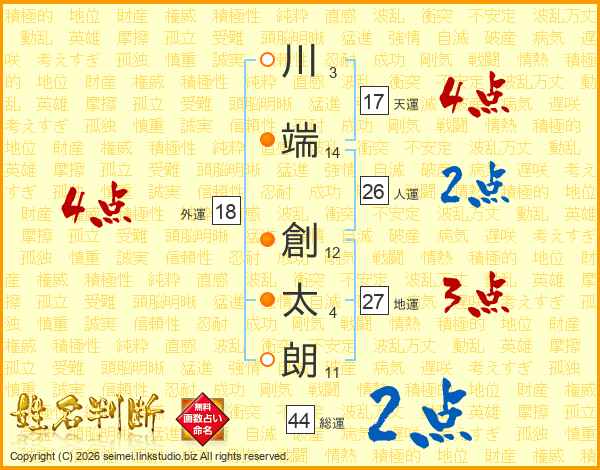 川(3画)端(14画) 創(12画)太(4画)朗(11画)