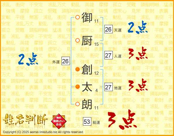 御(11画)厨(15画) 創(12画)太(4画)朗(11画)