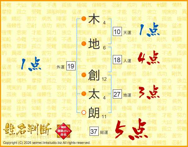 木(4画)地(6画) 創(12画)太(4画)朗(11画)