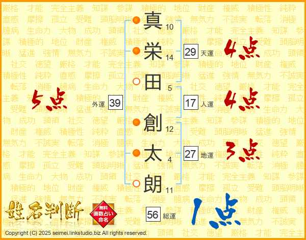 真(10画)栄(14画)田(5画) 創(12画)太(4画)朗(11画)
