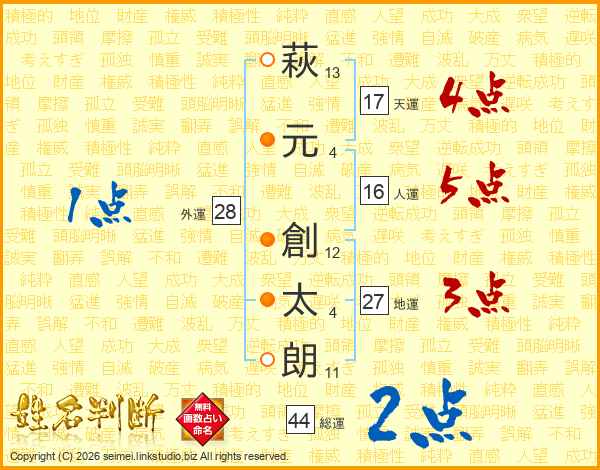 萩(13画)元(4画) 創(12画)太(4画)朗(11画)