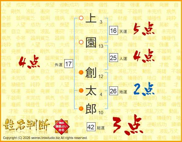 上(3画)園(13画) 創(12画)太(4画)郎(10画)