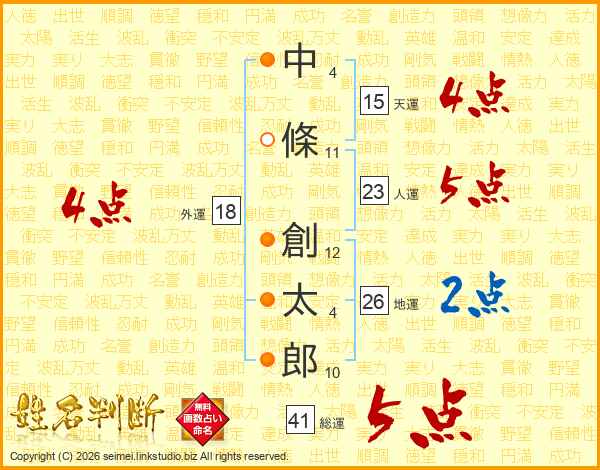 中(4画)條(11画) 創(12画)太(4画)郎(10画)