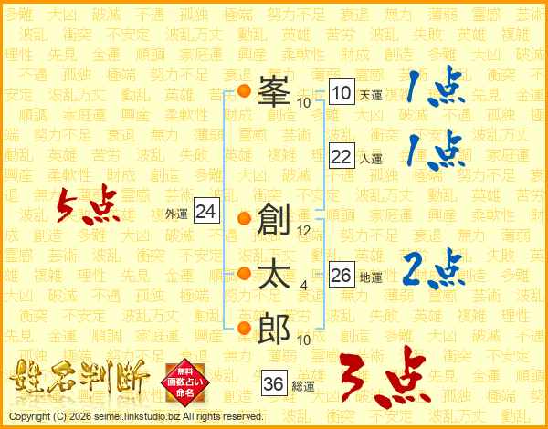 峯(10画) 創(12画)太(4画)郎(10画)