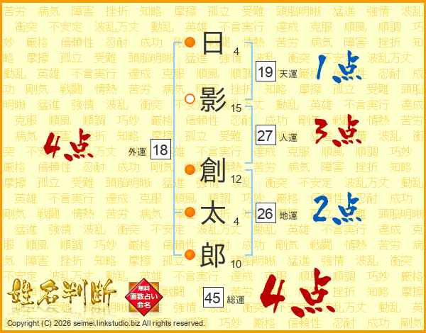 日(4画)影(15画) 創(12画)太(4画)郎(10画)
