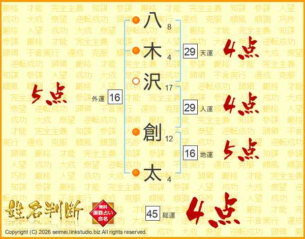 八(8画)木(4画)沢(17画) 創(12画)太(4画)