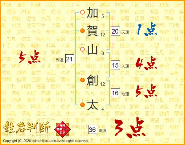 加(5画)賀(12画)山(3画) 創(12画)太(4画)