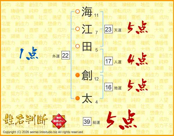 海(11画)江(7画)田(5画) 創(12画)太(4画)