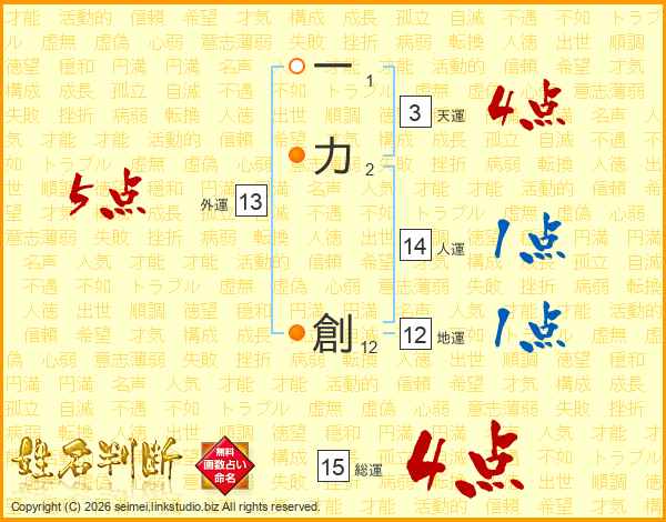 生活面を象徴する運勢です。外部から受ける影響力を表し、結婚運、家庭運や職場、環境への順応性を表します。総運から人運を引いた画数。姓や名が1文字の場合を除く。