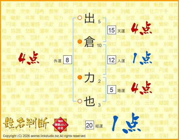 出倉力也さんの総運は20画の1点!