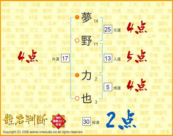 生活面を象徴する運勢です。外部から受ける影響力を表し、結婚運、家庭運や職場、環境への順応性を表します。総運から人運を引いた画数。姓や名が1文字の場合を除く。