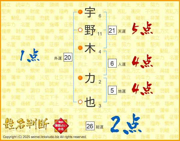 宇野木力也さんの天運は21画の5点!