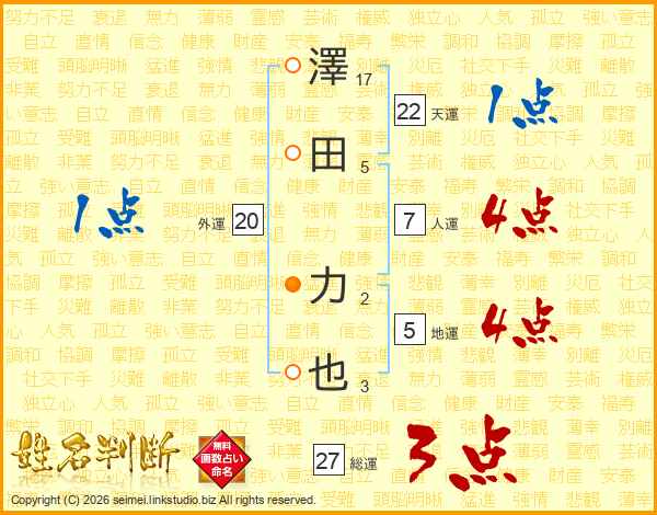 生活面を象徴する運勢です。外部から受ける影響力を表し、結婚運、家庭運や職場、環境への順応性を表します。総運から人運を引いた画数。姓や名が1文字の場合を除く。