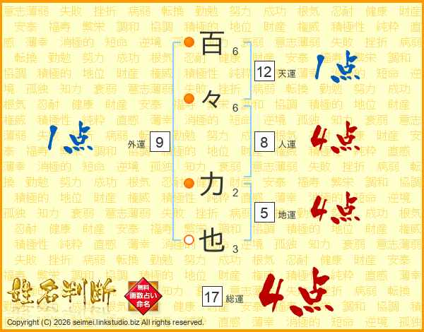 生活面を象徴する運勢です。外部から受ける影響力を表し、結婚運、家庭運や職場、環境への順応性を表します。総運から人運を引いた画数。姓や名が1文字の場合を除く。