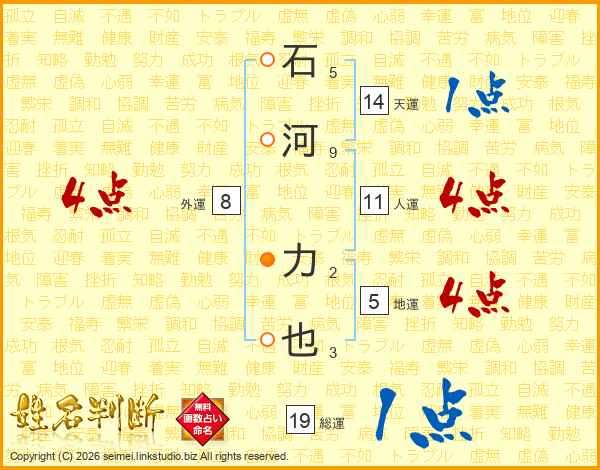 生活面を象徴する運勢です。外部から受ける影響力を表し、結婚運、家庭運や職場、環境への順応性を表します。総運から人運を引いた画数。姓や名が1文字の場合を除く。