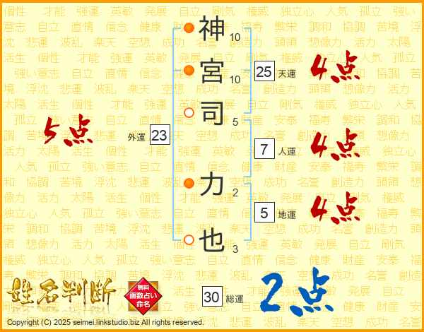 神(10画)宮(10画)司(5画) 力(2画)也(3画)