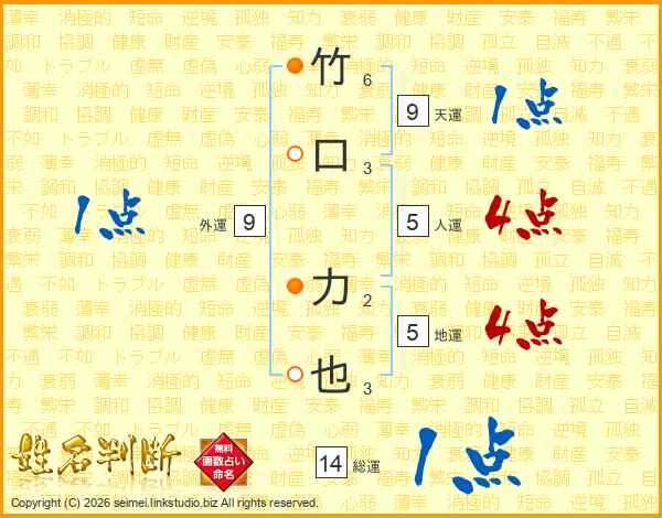 生活面を象徴する運勢です。外部から受ける影響力を表し、結婚運、家庭運や職場、環境への順応性を表します。総運から人運を引いた画数。姓や名が1文字の場合を除く。