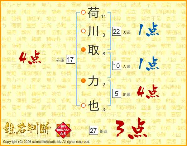荷川取力也さんの総運は27画の3点!