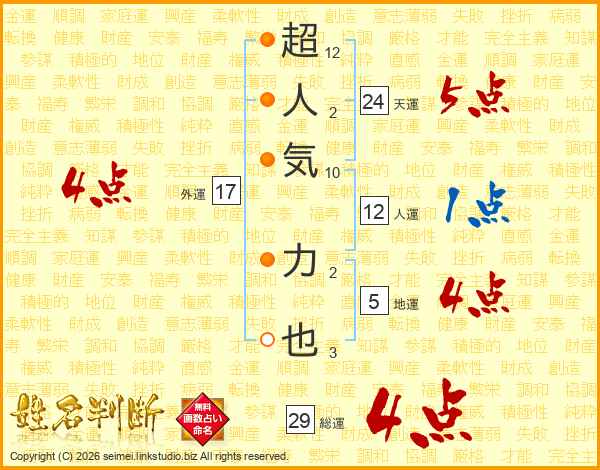 超人気力也さんの総運は29画の4点!