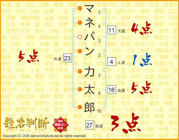 マ(2画)ネ(4画)パ(3画)ン(2画) 力(2画)太(4画)郎(10画)