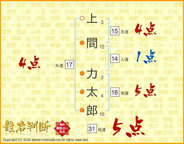 上(3画)間(12画) 力(2画)太(4画)郎(10画)