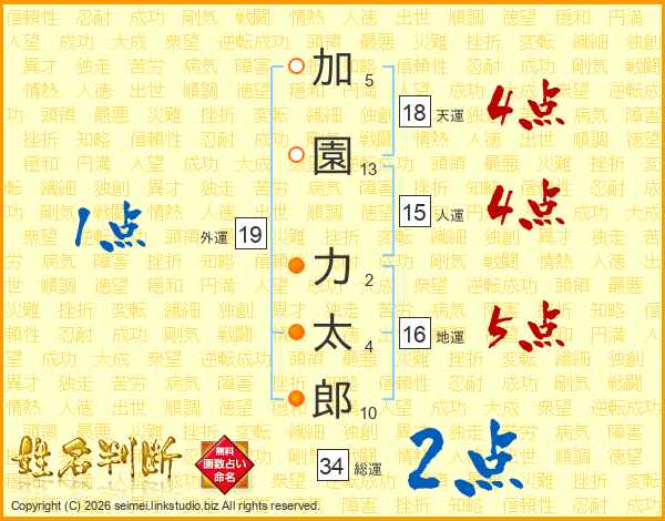 加(5画)園(13画) 力(2画)太(4画)郎(10画)