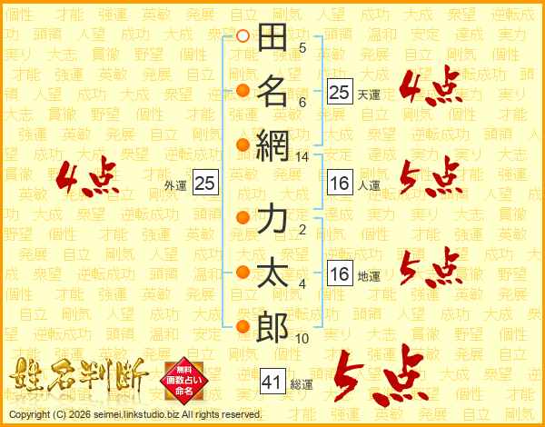 田(5画)名(6画)網(14画) 力(2画)太(4画)郎(10画)