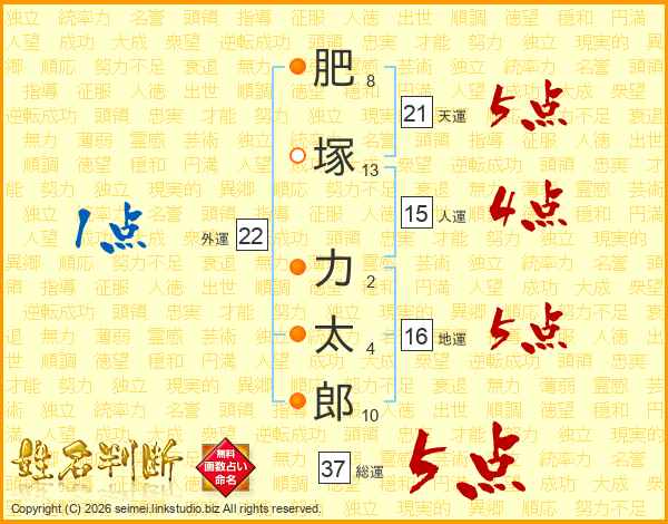 肥(8画)塚(13画) 力(2画)太(4画)郎(10画)