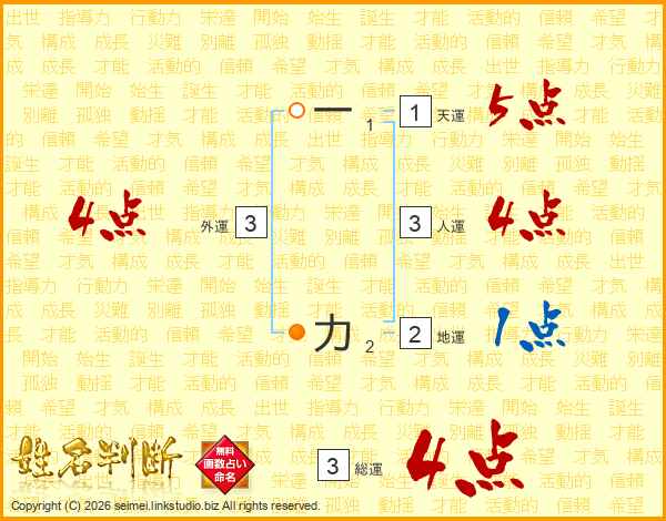 生活面を象徴する運勢です。外部から受ける影響力を表し、結婚運、家庭運や職場、環境への順応性を表します。総運から人運を引いた画数。姓や名が1文字の場合を除く。