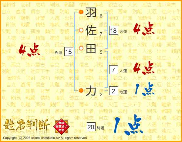 生活面を象徴する運勢です。外部から受ける影響力を表し、結婚運、家庭運や職場、環境への順応性を表します。総運から人運を引いた画数。姓や名が1文字の場合を除く。