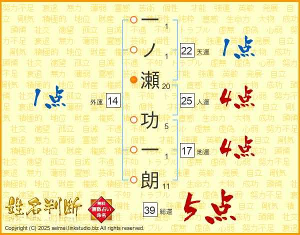一ノ瀬功一朗さんの総運は39画の5点!