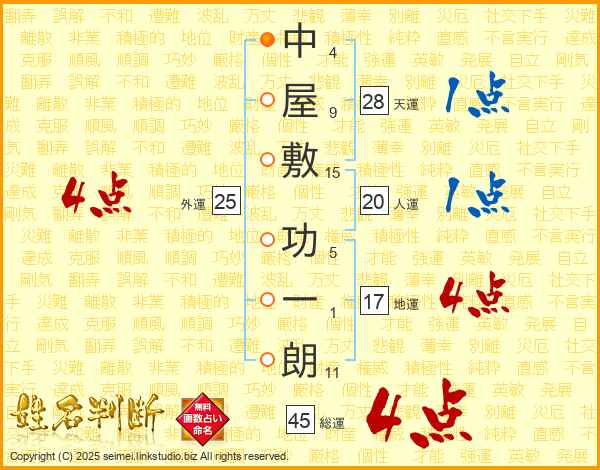 中屋敷功一朗さんの総運は45画の4点!