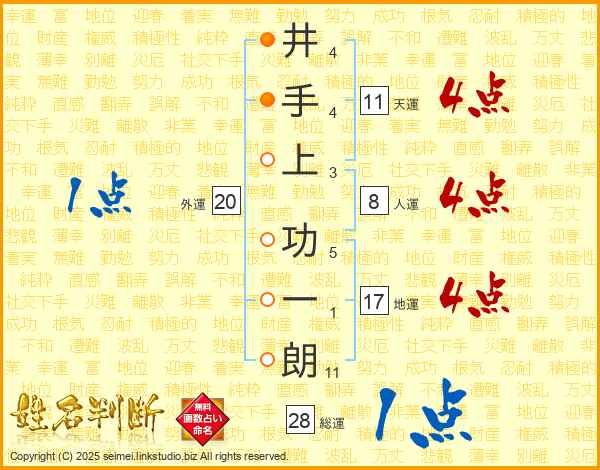 井(4画)手(4画)上(3画) 功(5画)一(1画)朗(11画)