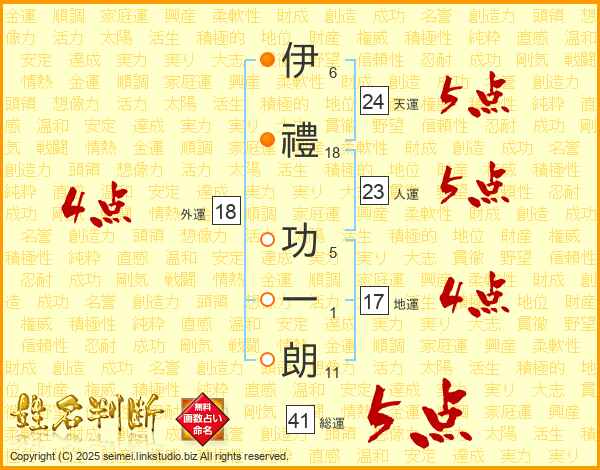 伊(6画)禮(18画) 功(5画)一(1画)朗(11画)