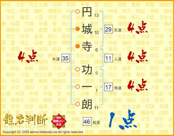 円(13画)城(10画)寺(6画) 功(5画)一(1画)朗(11画)