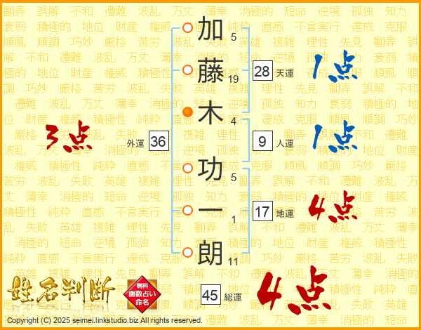 加(5画)藤(19画)木(4画) 功(5画)一(1画)朗(11画)