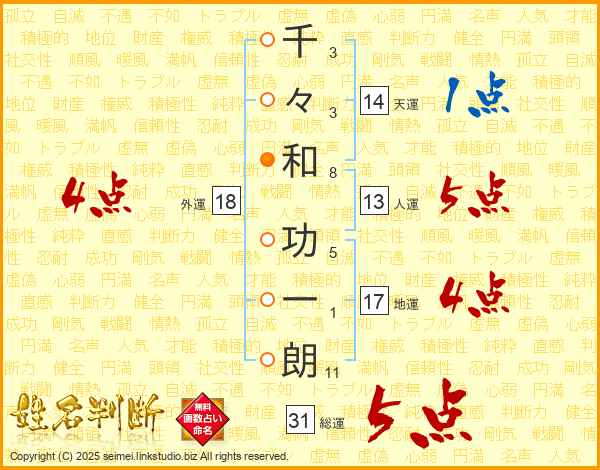 千(3画)々(3画)和(8画) 功(5画)一(1画)朗(11画)