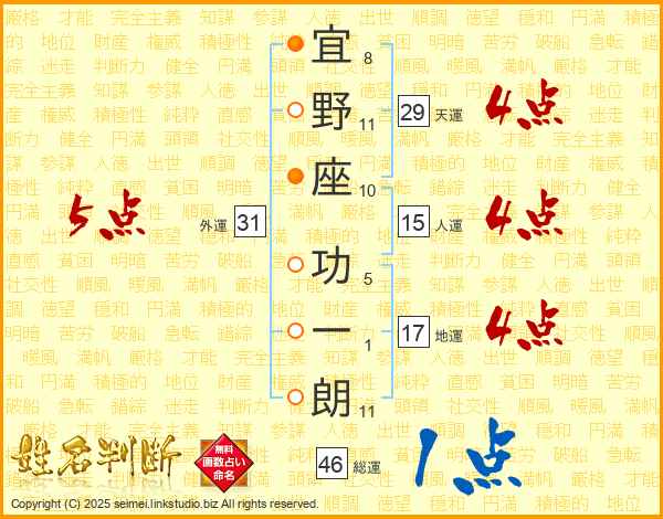宜(8画)野(11画)座(10画) 功(5画)一(1画)朗(11画)