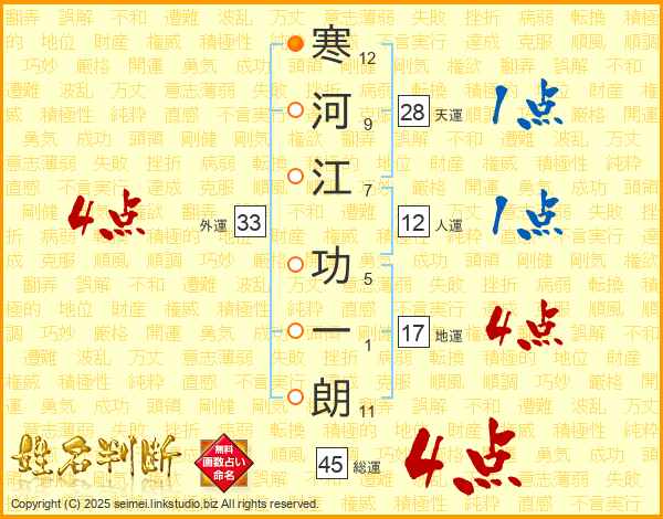 寒(12画)河(9画)江(7画) 功(5画)一(1画)朗(11画)